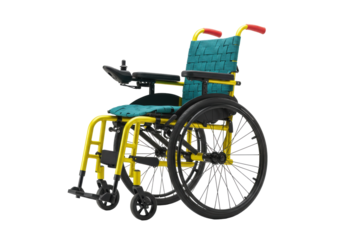 Isolated power wheelchair with joystick controller, yellow frame, green fabric seat and backrest