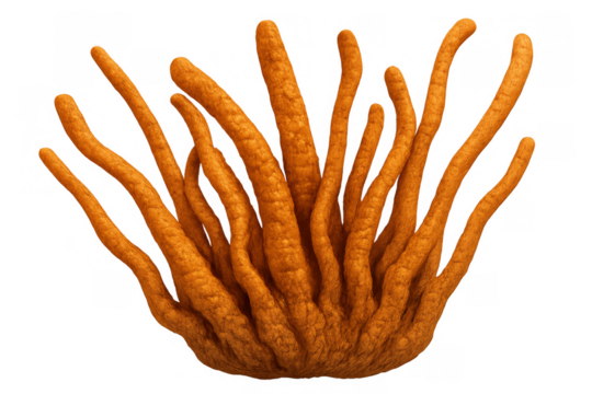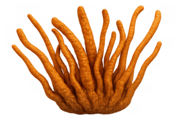 Cordyceps mushroom extract, a group of orange medicinal fungi, with a transparent background for health and wellness concepts
