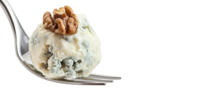 fork with a stuffed date, filled with creamy blue cheese and topped with a walnut for added texture. isolated on white background.