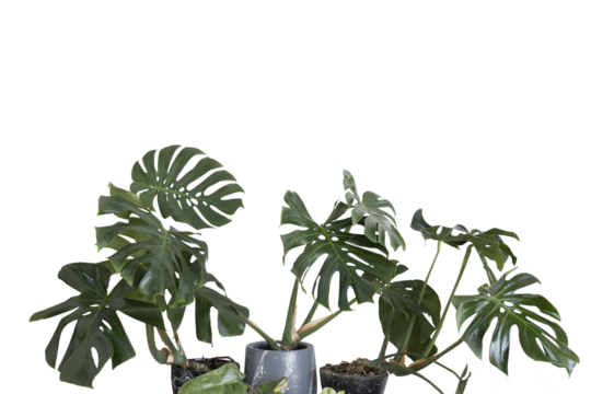 Monstera plants in pots inside the building add to the shady atmosphere in the building. Transparency background in PNG file