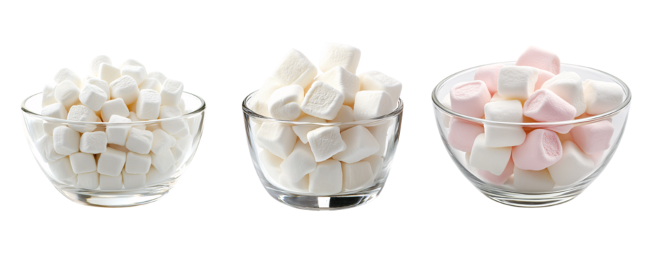 Marshmallows in glass bowls collection isolated on a transparent background, confectionery PNG