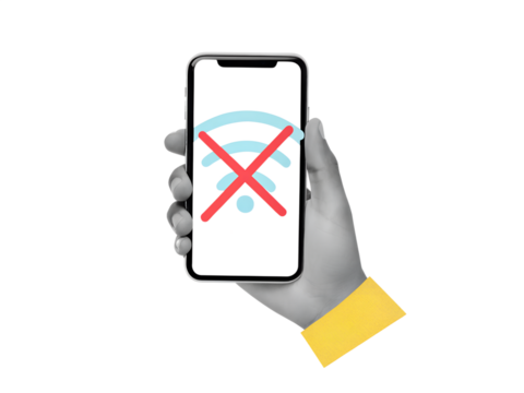 Black and white hand holding a phone with a crossed Wi-Fi sign on a screen. Modern photo collage style. Illustration on transparent background