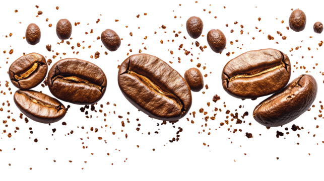 Image showcases numerous roasted coffee beans floating mid-air against white background, captured in dynamic motion with soft lighting. Some beans show natural cracks, adding texture