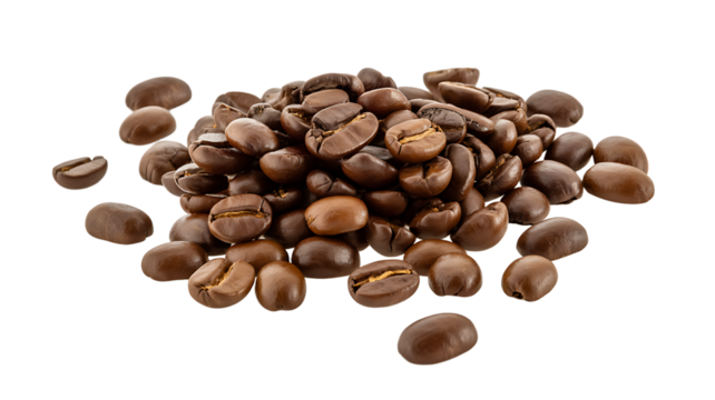 a rich pile of dark roasted coffee beans, with some scattered beans adding a sense of movement