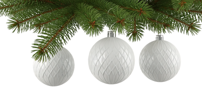 Elegant white christmas ornaments hanging from a fir branch isolated on transparent background, perfect for adding a touch of sophistication to your holiday designs