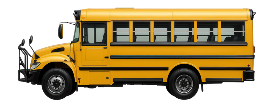 School bus with front-mounted bike carrier and additional side safety mirrors