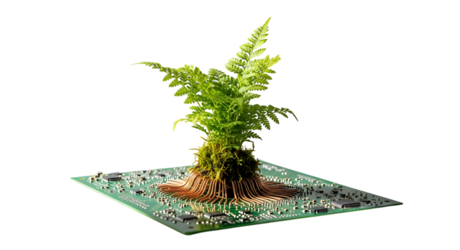 Green Plant Growing from Circuit Board Symbolizing Sustainable Technology and Innovation