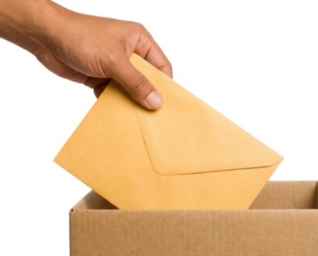 A hand is placing a yellow envelope into a cardboard box, suggesting the act of mailing or submitting documents.