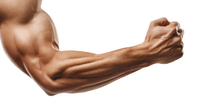Muscular arm of a fit man flexing his bicep in a powerful pose on transparent background