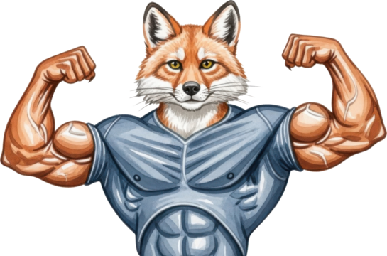 Muscular cartoon fox flexing muscles isolated on transparent background