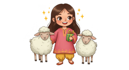 Illustration Girl with Sheep Gift Celebrating Eid Al Adha Cartoon
