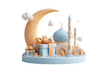 Eid mubarak celebration with mosque and gifts on crescent moon isolated on transparent background