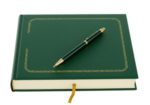 Isolated Green leather bound book journal with pen writing concept, memory keeping, business notes