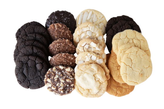 A detailed view of assorted cookies with various textures and flavors, such as almond, coconut, and vanilla, arranged artistically on a pristine white surface