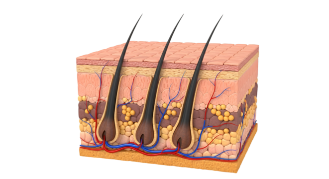 3D rendering of skin cross-section depicting a hair follicle, sebaceous gland, arrector pili muscle, adipose tissue, and blood vessel. background removed