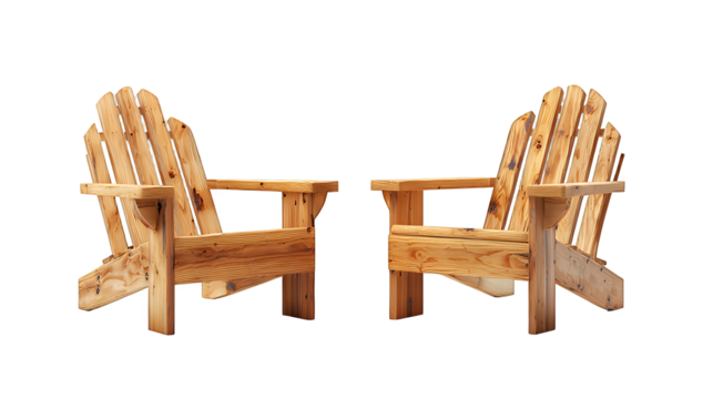 Pair of wooden adirondack chairs facing each other, creating a welcoming outdoor seating arrangement for relaxation