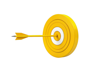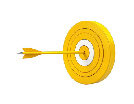 A golden arrow hits the bullseye of a yellow and white target, isolated on black