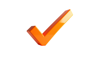 A 3D render of an orange, shiny checkmark against a stark black background. It appears three-dimensional and has a reflective finish