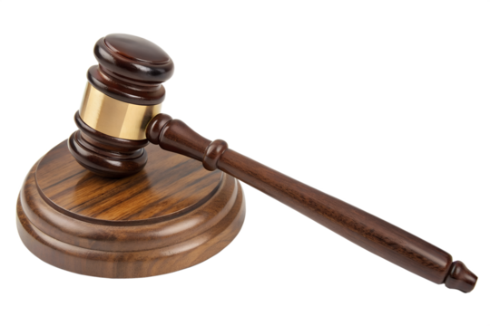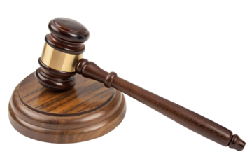 Gavel: A striking depiction of a wooden gavel, resting on a matching base, symbolizing justice and authority, ready to administer order in a courtroom.