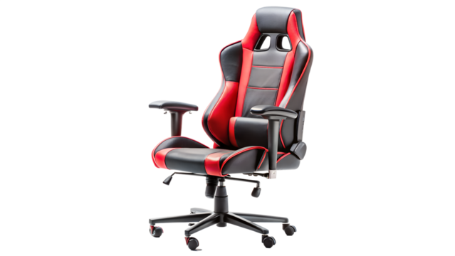 Ergonomic gaming chair isolated on transparent background, designed for comfort and support during long gaming sessions, featuring adjustable armrests and lumbar support