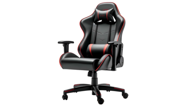 Sleek black gaming chair with red accents against a dark background