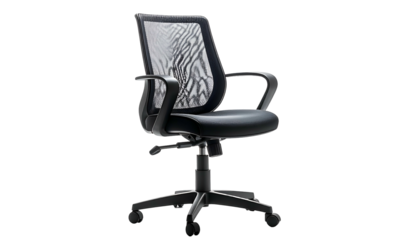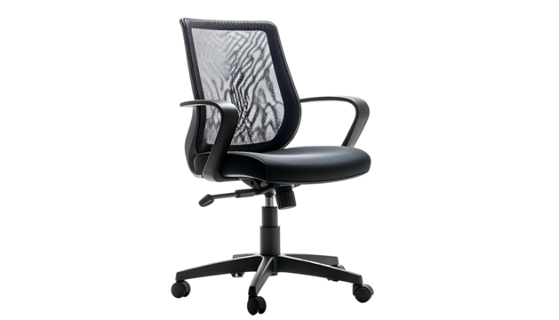 Ergonomic black office chair with mesh back, arms, and adjustable height on wheels
