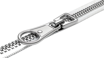 Close up of a Black fabric zipper with metal slider and teeth isolated on a transparent background
