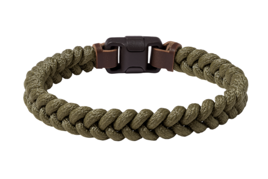 Olive Green Paracord Bracelet with Leather Accents isolated on a transparent background