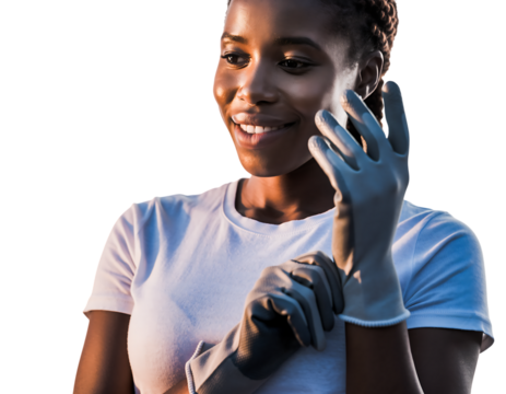 Smiling young Black woman with braided hair, wearing white t shirt, putting on gray protective glove, showing, isolated on white background