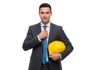 Young male construction worker adjusting hard hat and goggles, equipped with safety harness, ready for site work. background removed