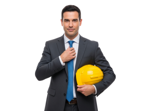 Senior worker adjusting hard hat isolated on transparent background