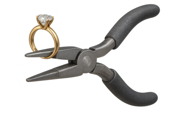 Sparkling diamond ring held by jewelry pliers, isolated on transparent background