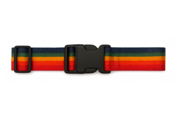 A close up shot of an orange safety harness with metal buckles and black plastic adjusters isolated