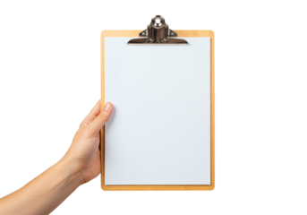 A wood-framed clipboard with a blank white paper, viewed from above, isolated