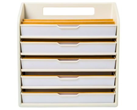 White desktop file organizer with five sliding trays and folders on a transparent background