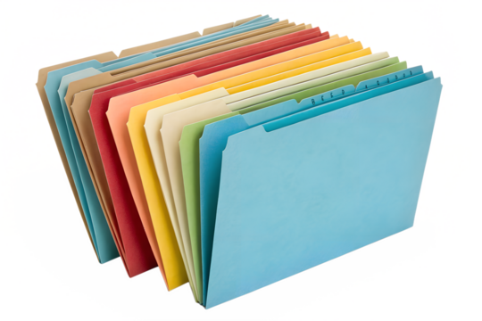 A vibrant array of colorful office file folders fanned out and isolated on a clean white background, perfect for organization and document management in any workspace
