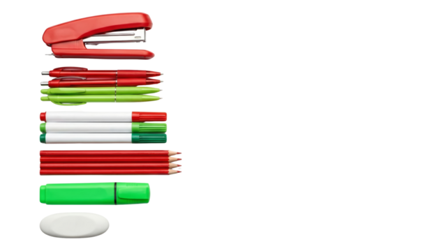 Transparent office supplies illustration: clock, notebook, calendar, calculator