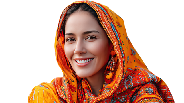 Radiant Smile: Portrait of a woman, adorned in an intricately patterned headscarf, her genuine happiness shining through in a warm, inviting smile.