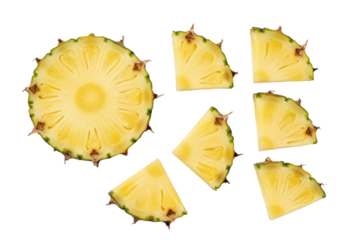 Bright yellow pineapple slices, including one large cross-section and juicy wedges with green rind, isolated on a pristine transparent background, top-down flat lay concept of tropical fruit freshness