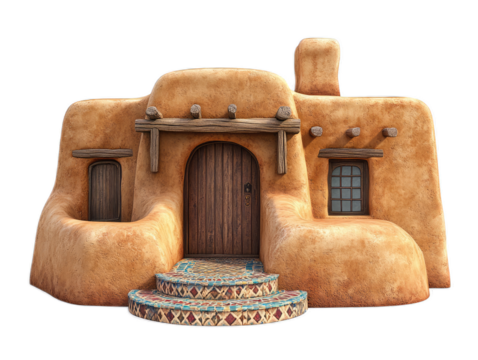 Desert adobe house with clay walls and rustic texture isolated on transparent background