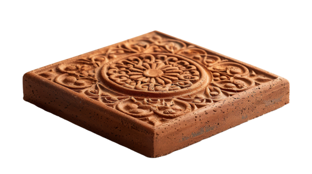 Terracotta ceramic tiles in square shape with intricate carvings, isolated on transparent background. PNG