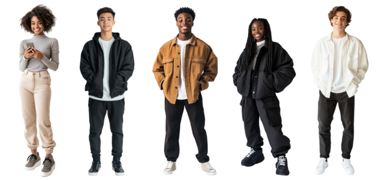 Happy young girl, portrait and casual fashion standing isolated on a transparent PNG background. Gen z, teenager or female person smile and posing in happiness for youth, clothing or childhood