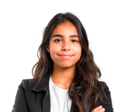 Portrait of a happy young Indian female student holding a book and wearing a backpack, ready for college or university, isolated on transparent background
