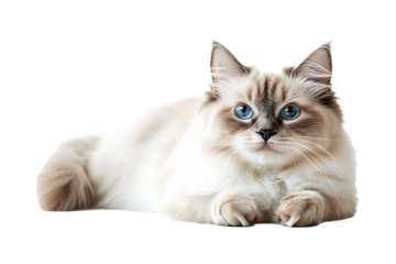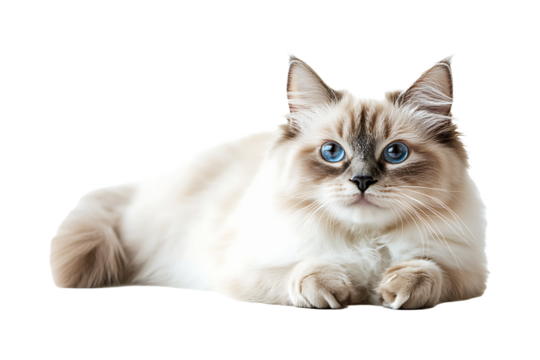 Fluffy Ragdoll cat looking at the camera isolated on transparent background.