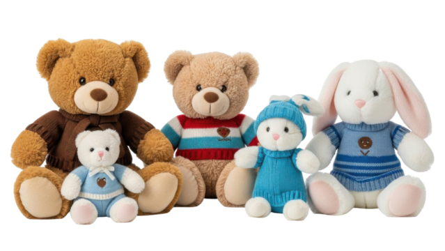 Group of adorable plush toys including teddy bears and a bunny rabbit, all soft and cuddly.