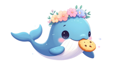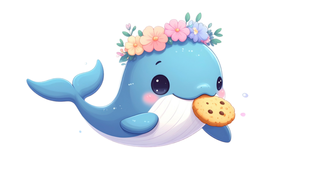 Adorable cartoon whale wearing flower crown, eating cookie on a transparent background
