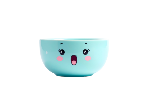 An adorable, animated, teal-colored bowl with a shocked expression on a black background