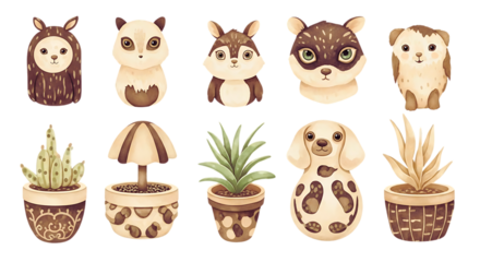 Collection of adorable cartoon animals and plants in pots, perfect for childrens illustrations isolated on transparent background