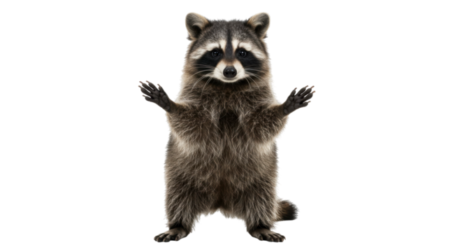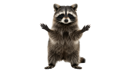 Two raccoons with detailed fur textures and expressive eyes are looking upwards against a plain white background, showcasing their features. isolated image, transparent background