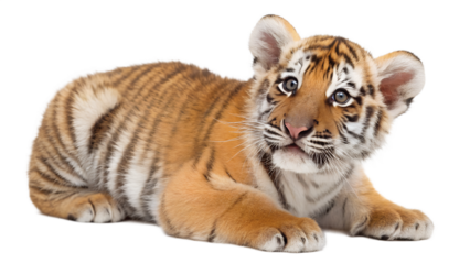 Adorable tiger cub with open mouth and curious eyes lying down, perfect for wildlife conservation campaigns and animalthemed promotions